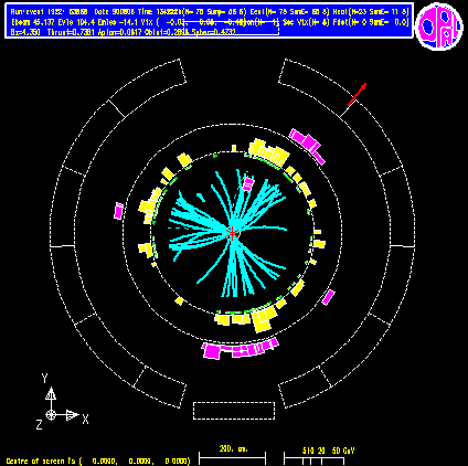 In Cambridge we wrote the software which allows OPAL physicists to display events. A wide range of different displays is available, and the program ran using standard software packages on all the different kinds of computers used in OPAL at the time. You can look at an extensive selection of events recorded in OPAL. On the right is an example (of a Z boson decaying into quarks).
